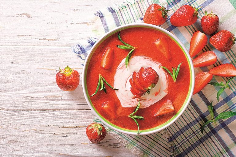Pokrájíme 300 g jahod, dáme je do hrnce, podlijeme pár lžícemi vody, přidáme 2 lžičky vanilkového extraktu, tři lístky máty a přivedeme k varu. Vypneme a necháme vychladnout. Směs rozmixujeme s e čtyřmi lžícemi medu a pár lžičkami limetové, pomerančové a citronové šťávy dohladka. Pak přidáme zbylé jahody a ještě několika pulzy prosekáme nahrubo. Rozdělíme […]