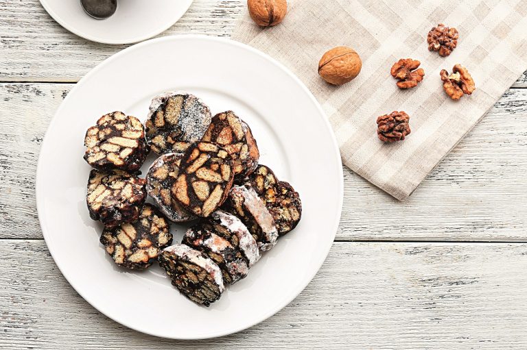 Suroviny: 300 g piškotů 2 lžíce rumu 250 g tuku nebo hery ½ plechovky kondenzovaného mléka 4 lžíce kakaa 50 g moučkového cukru Postup: Piškoty překrájíme na menší kousky, vložíme do misky a pokapeme rumem. Změklou heru vyšleháme se slazeným mlékem, kakaem a s cukrem. Do vyšlehaného másla vmícháme kousky piškotů, pak hmotu na vále […]