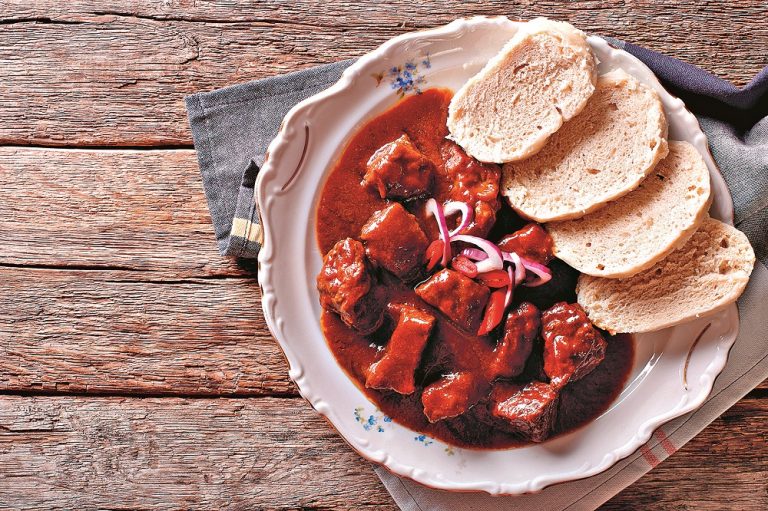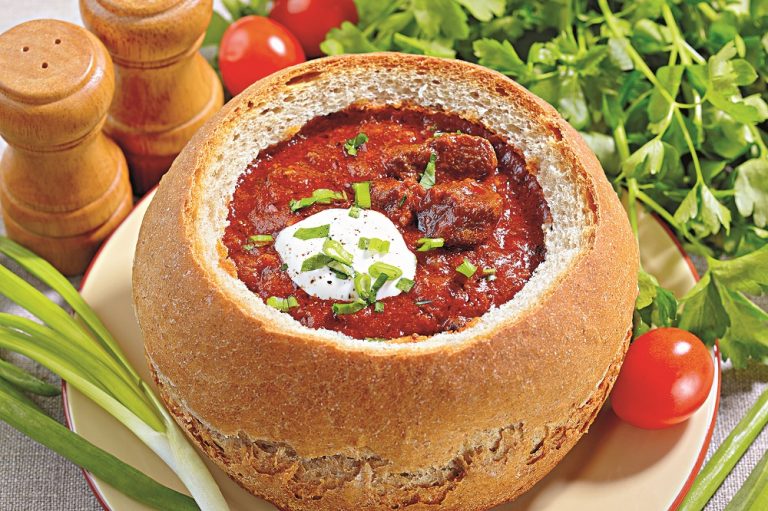 Suroviny: 50 g másla nebo sádla 1 velká cibule 500-600 g hovězí přední kližky 1 lžička sladké a pálivé papriky sůl a pepř 500 ml hovězího vývaru 2 lžíce hladké mouky 150 ml smetany ke šlehání 4 malé bochníky chleba k podávání zakysaná smetana, bylinky na ozdobu Postup: V hrnci vhodném do trouby pět až […]