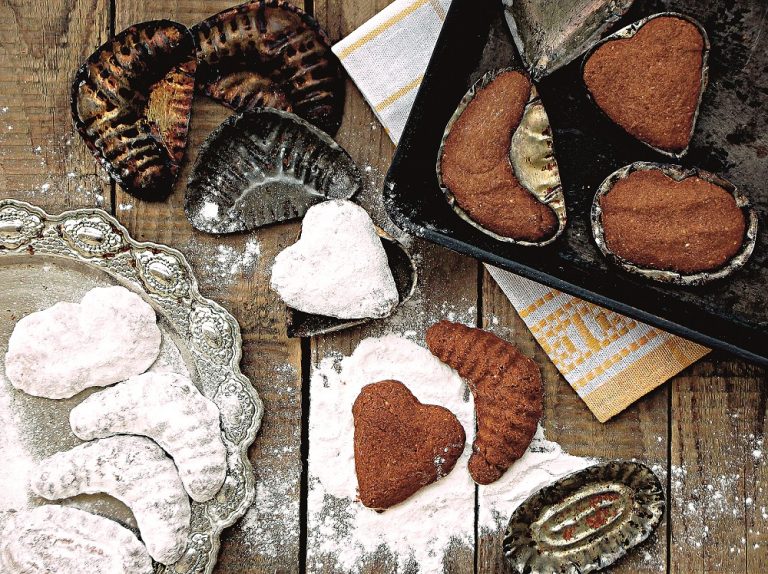 Suroviny: 500 g hladké mouky 450 g tuku nebo hery 140 g moučkového cukru 100 g čerstvě mletých ořechů 5 čerstvě mletých hřebíčků 1 lžička mleté skořice 1 lžíce kakaa moučkový a vanilkový cukr Postup: Troubu předehřejeme na 170 °C. Všechny přísady zpracujeme na pevné těsto a polovinu obarvíme kakaem. Necháme odpočinout několik hodin, nejlépe […]