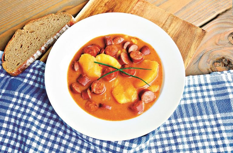 Suroviny: 1 kg brambor 4 špekáčky nebo 6 párků 2 lžíce sádla 1 větší cibule 3 stroužky česneku 1 lžíce mleté papriky a drceného kmínu 2 lžíce majoránky sůl, petrželka Postup: Brambory oloupeme a nakrájíme na kostky, uzeninu nakrájíme na kostičky nebo na kolečka. V hrnci na sádle necháme zesklovatět cibuli. Přisypeme uzeninu a trochu […]