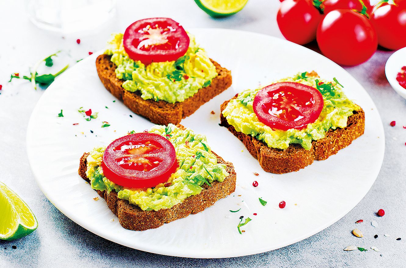 3. Tousty nebo jiné pečivo opečte nasucho nebo na olivovém oleji. Na každý toust namažte vrstvu guacamole a navrch ozdobte nakrájenými rajčaty.