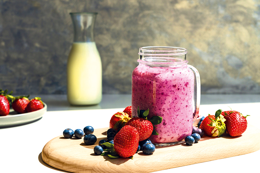 Přidejte mléko a podle chuti oslaďte medem, případně sirupem. ν Pokud chcete smoothie hustší a studenější, přidejte i pár kostek ledu nebo trochu ledové tříště.