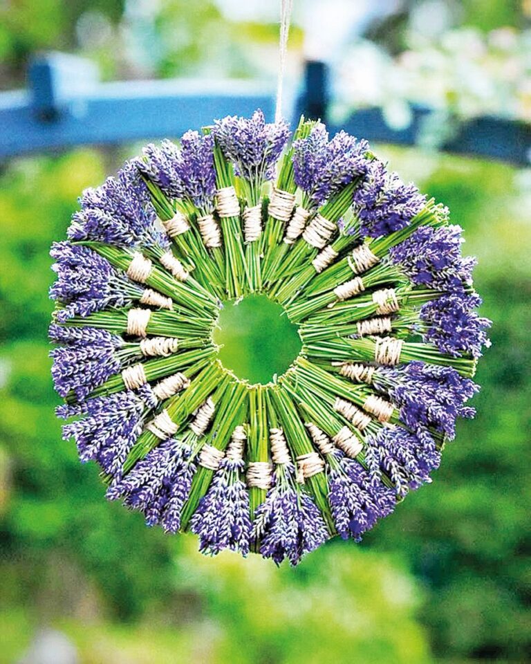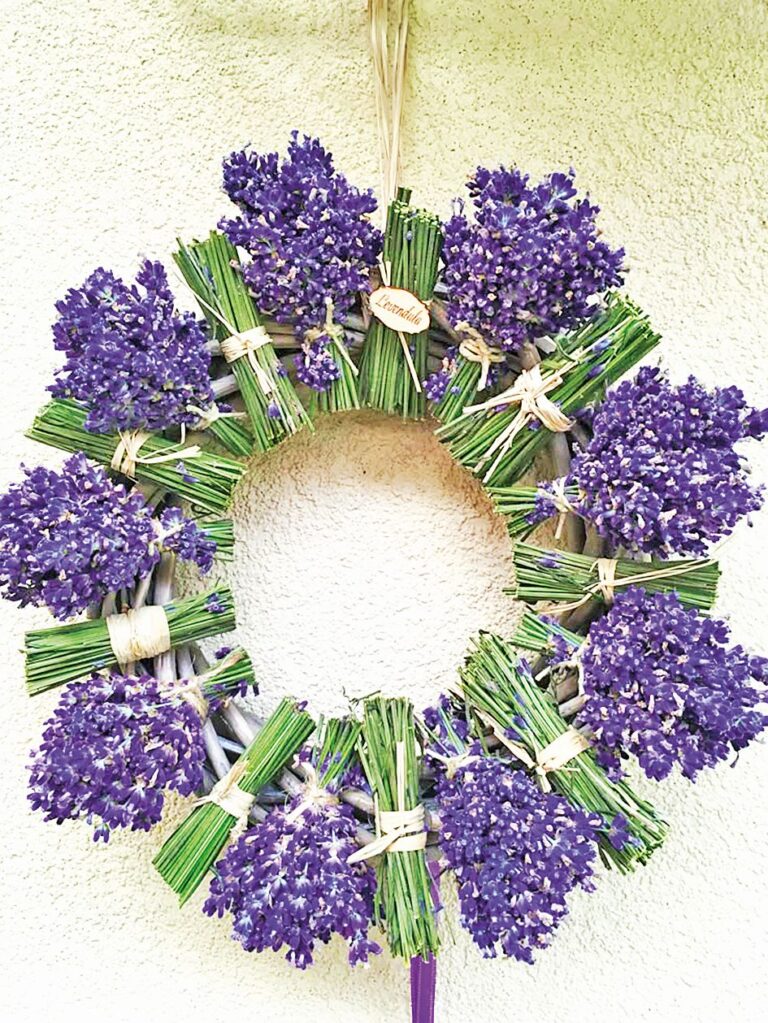 Svazečky usušené levandule stačí připevnit na věnec a dekorace na dveře je hotová.