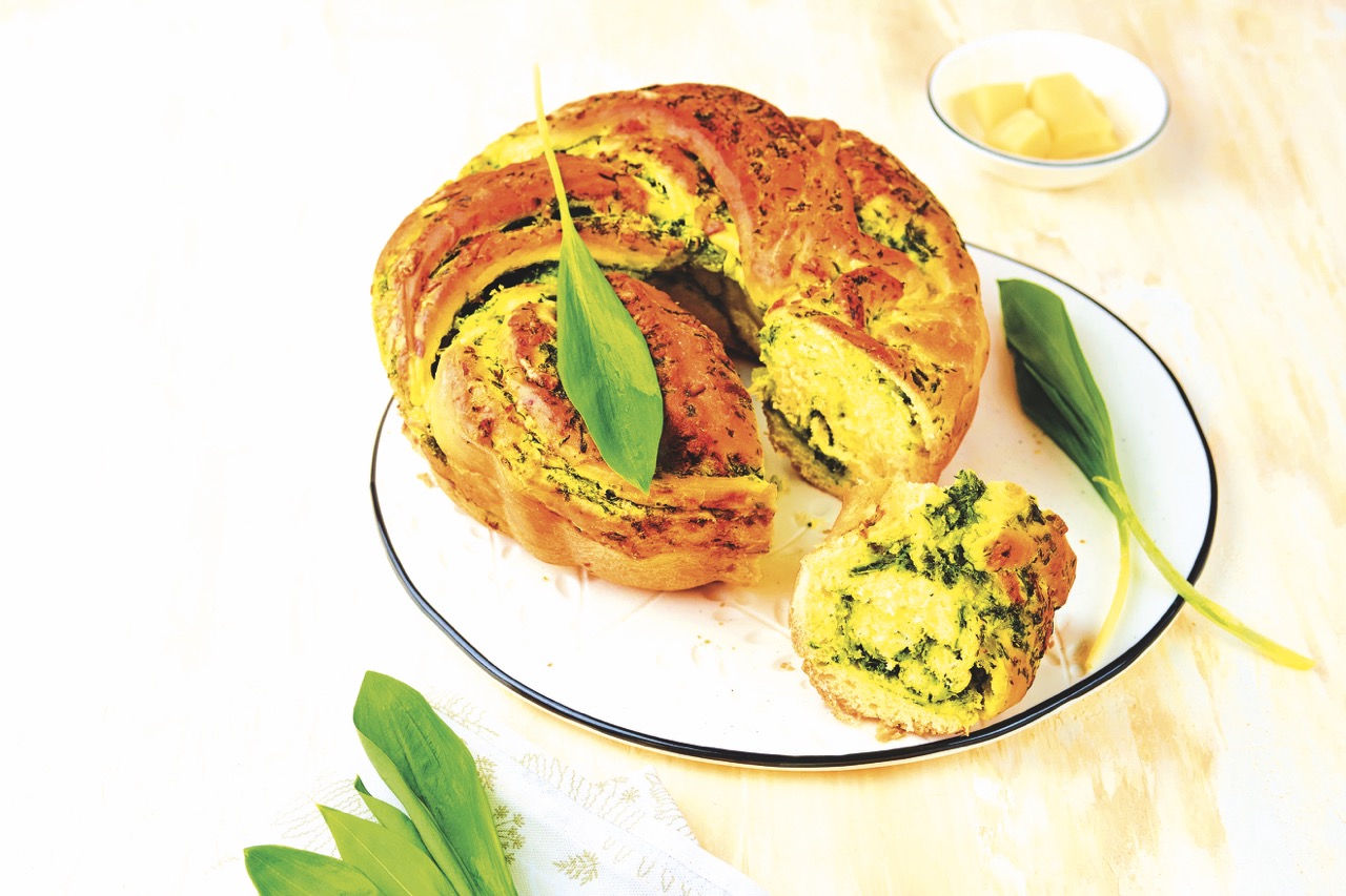 Pak vezměte do ruky oba konce a lehce zatočte každý do opačného směru jako při ždímání prádla. Nakonec spojte do kruhu s volným středem. Přesuňte věnec na plech a potřete vejcem. Pečte při 185 °C zhruba 30 minut, dokud se neobjeví jemně zlatý povrch.