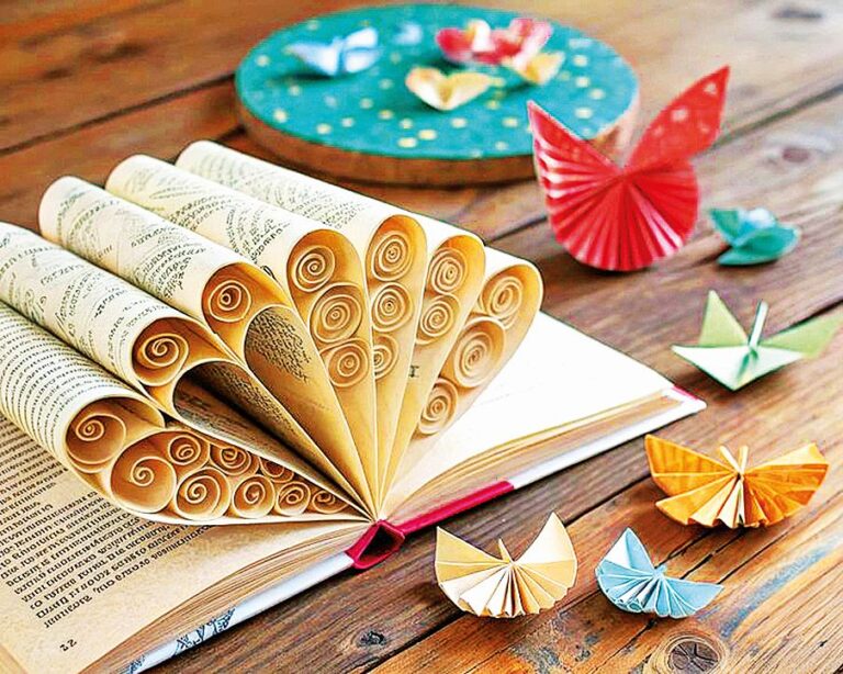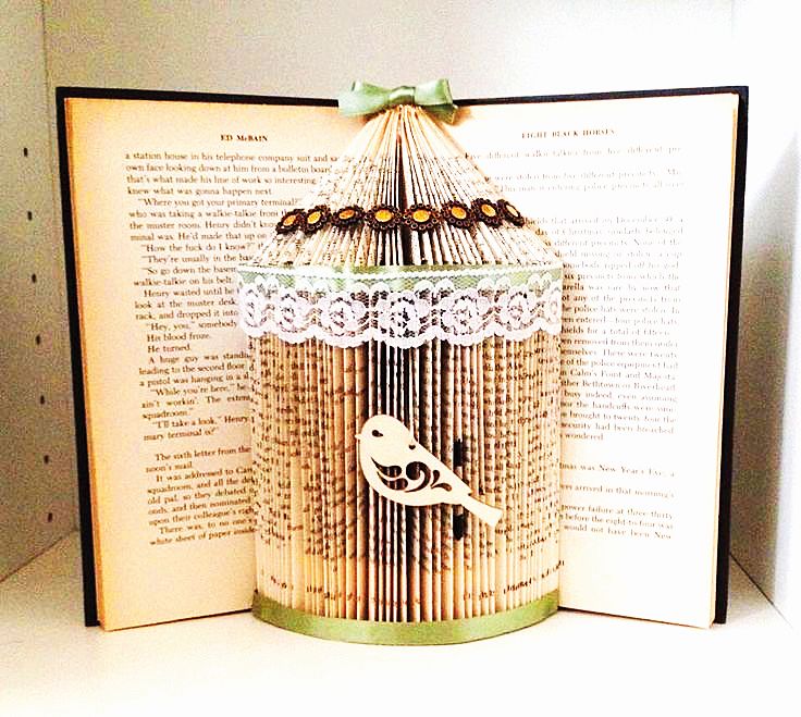 Ze starých knih můžete vytvořit třeba papírové květiny, které působí velice křehce a romanticky. Další možností jsou skládané závěsné dekorace, věnce, různé malé i velké ozdůbky nebo dokonce trojrozměrné sošky.
