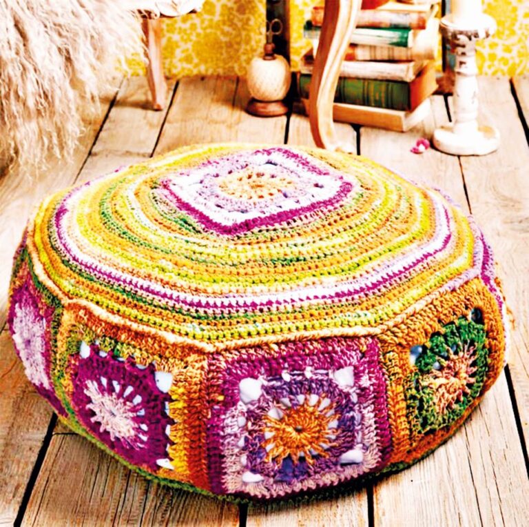 – Měkoučký taburet s háčkovaným přehozem je velice pohodlný.
