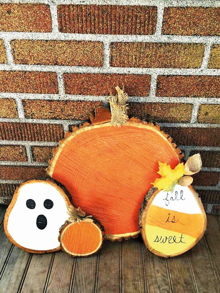 Podzimní výzdoba se neobejde bez dýně. Pokud ji kvůli tvoření nechcete kupovat v obchodě, můžete si ji vyrobit! Připravte si dřevěnou kulatinu o tloušťce asi 2 cm. Jednu stranu obruste smirkovým papírem a natřete ji oranžovou barvou.