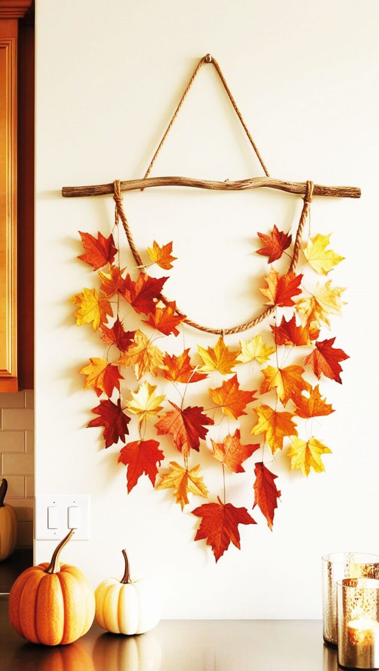 Poté ustřihněte několik kusů jutového provázku a na každý z nich přivažte pár usušených podzimních listů, které jste předem vylisovala v těžké knize. Na závěr provázek připevněte na dřevo a vzniklou dekoraci pověste na zeď.