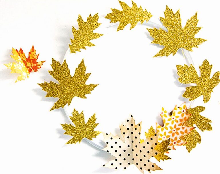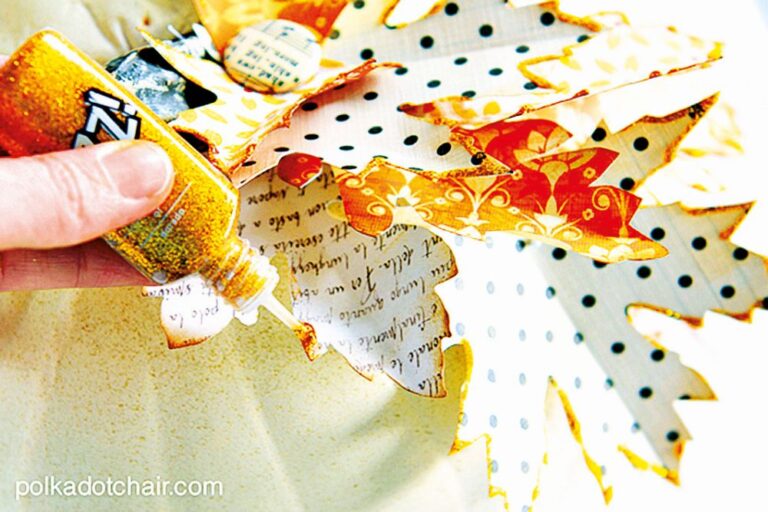 4. Okraje vybraných listů natřete třpytivým lepidlem a na vrchní stranu věnce přilepte saténovou nebo jutovou stuhu. Věnec zavěste na viditelné místo, nejlépe se bude vyjímat na vchodových dveřích.