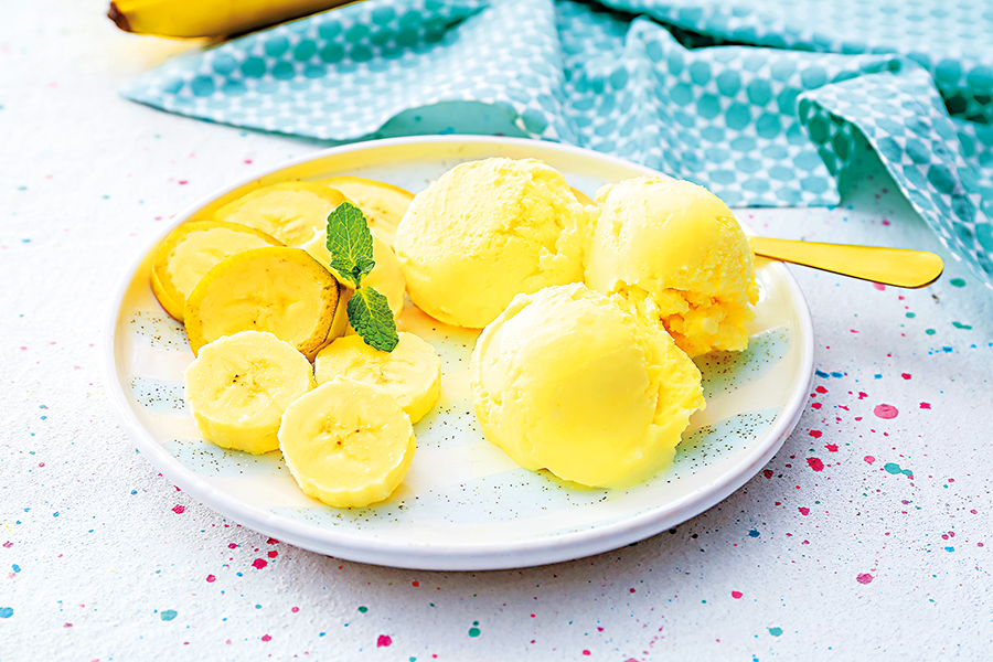 Do mixéru vložte zmražené banány, smetanu, mléko, med, citronovou šťávu a několik lístků čerstvé máty. Vše rozmixujte.