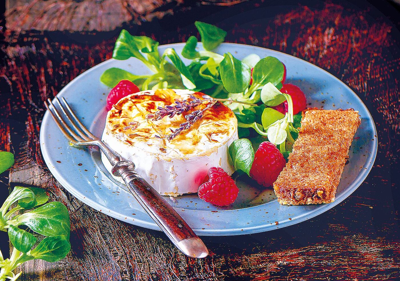 2. Na talíře rozdělte polníček, na něj položte grilované kozí sýry a přelijte je bylinkovým medem. Přidejte pár malin, případně dozdobte bylinkami.