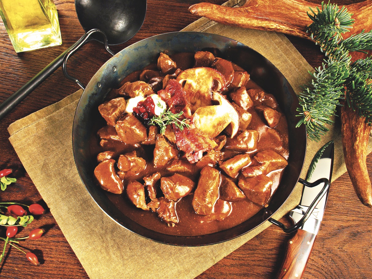 Přilejte polovinu vývaru a maso duste pod pokličkou doměkka. V průběhu vaření podle potřeby dolévejte vývar. Hotový guláš podávejte s brusinkami. Jako příloha bude chutnat knedlík i špecle.
