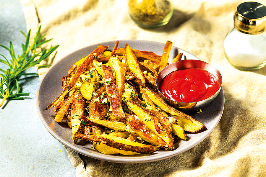 Hranolky posypejte prolisovaným nasekaným česnekem a dobře promíchejte.