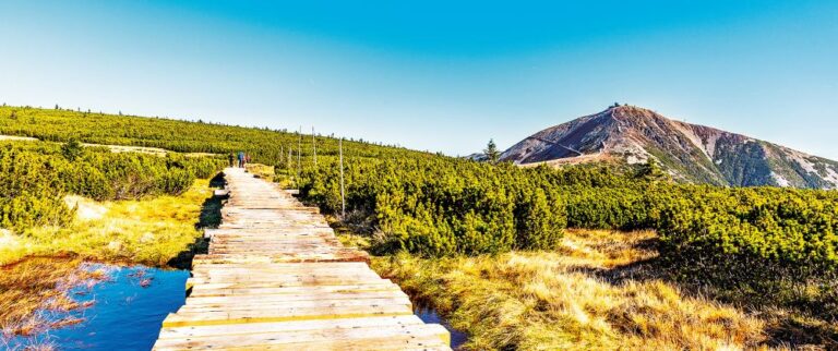 Na vrcholu Černé hory si můžete vyběhnout na rozhlednu Panorama a pak přes rezervaci Černohorské rašeliniště a přes Vebrovy boudy klesáte do Pece pod Sněžkou.