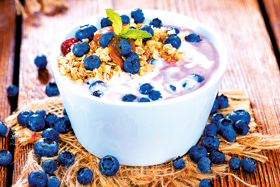Do misky dejte vrstvu jogurtu, přelijte borůvkami a znovu navrstvěte jogurt.