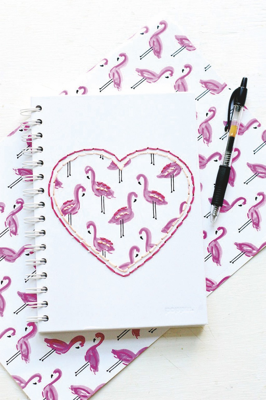 1) Ke zhotovení tohoto krásného designu budete potřebovat zápisník, bílou krycí barvu a štětec, bílou tapetu s potiskem, nůžky, barevné bavlnky a větší jehlu.