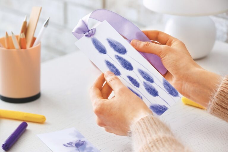 Vyrobit si můžete i půvabnou záložku do knížky. Z kartonu papíru vystřihněte 10 cm široký pásek a pomalujte ho dle fantazie. Nahoru nakonec přivažte stužku.
