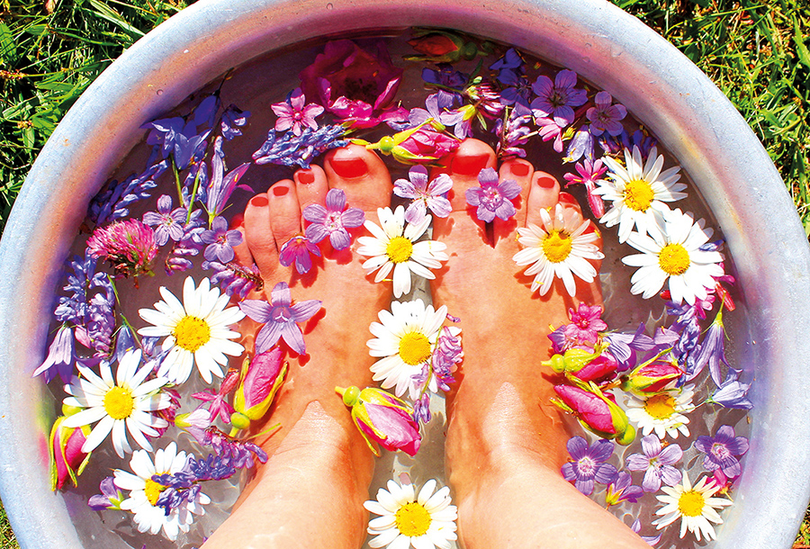 Přidejte do teplé vany pár hrstí sušeného heřmánku, měsíčku nebo levandule. Mají uklidňující účinky, a navíc zmírní každý zánět v těle – i otoky nohou.