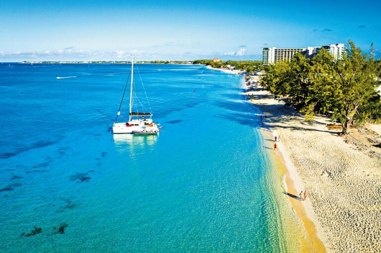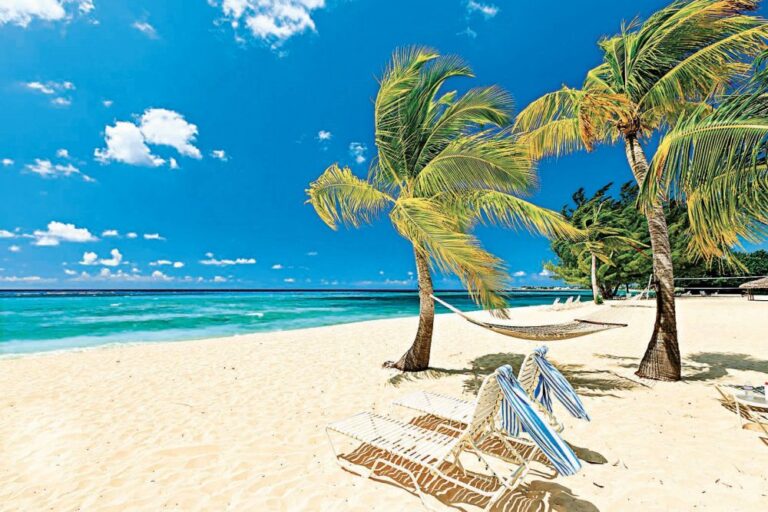 Oslnivě bílý písek, tyrkysové moře a velké palmy – to je ve zkratce nejkrásnější pláž Jamajky a jedna z nejkrásnějších na celé planetě – Seven Mile Beach.
