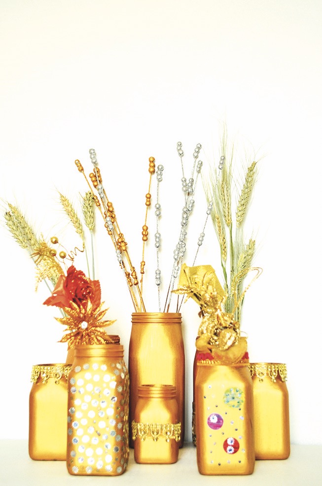 Když zvolíte nesmývatelnou zlatou barvu, kterou běžně pořídíte ve výtvarných potřebách, bude to vypadat fantasticky. Zaručeným tipem jsou třeba obyčejné sklenice od instantní kávy. Vyšperkujete z nich vázy!
