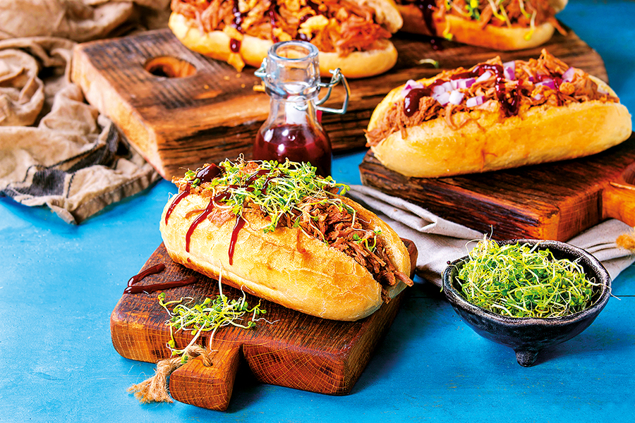 Housky rozkrojte, naplňte takto připraveným masem, zakápněte zbylou barbecue omáčkou a posypejte čerstvou řeřichou. Podávejte vždycky ještě teplé.