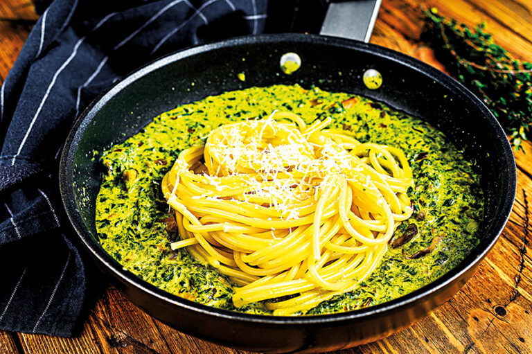 Dochutťe solí a pepřem. Pesto by mělo být lehce tekuté a svěže vonět po bylinkách.