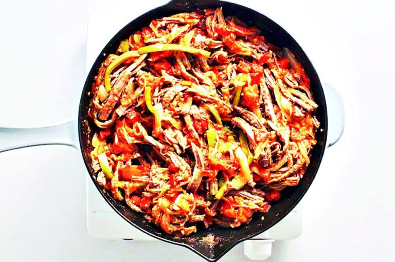 5. Do omáčky přidejte trhané maso, vše důkladně promíchejte a plamen stáhněte na minimum. Vše duste asi 40 minut, aby maso nasáklo chuť omáčky a pokrm krásně zhoustl. Poté pánev odstavte z plotny a přimíchejte do ní limetovou šťávu.