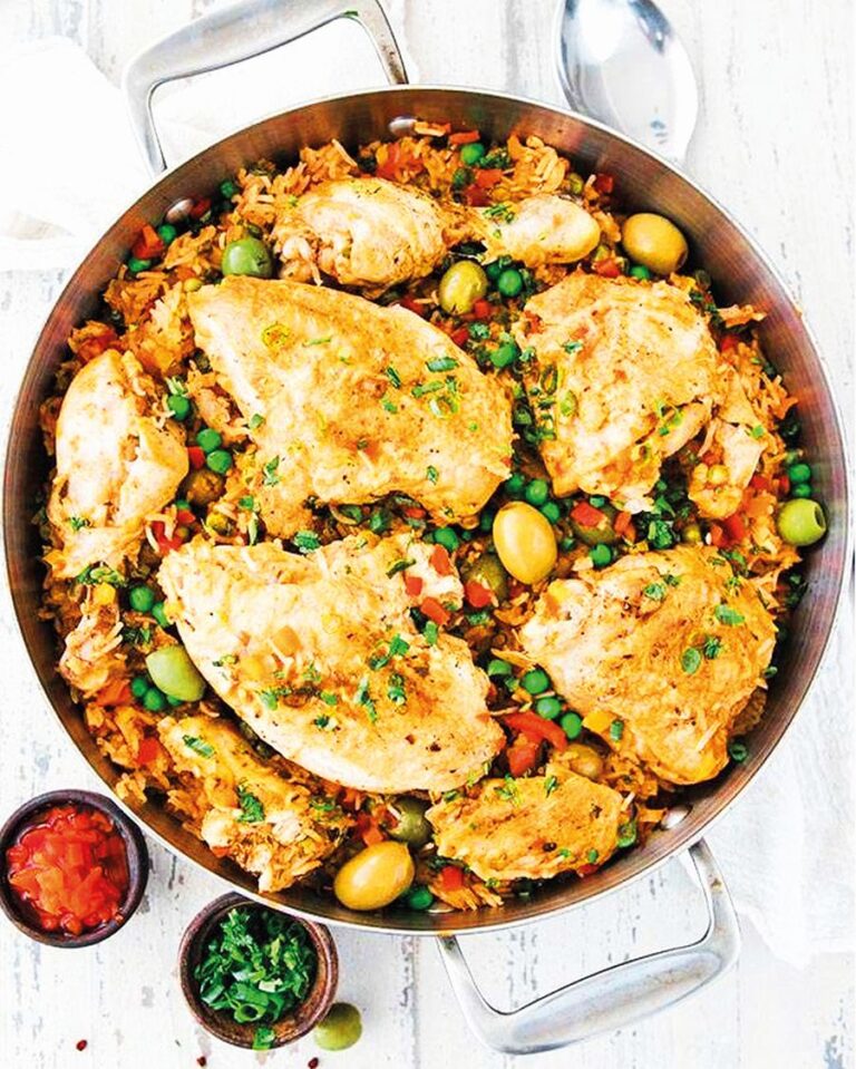 Na nízkém plameni pokrm duste asi půl hodiny, dokud rýže nenasákne všechnu tekutinu a maso nebude zcela měkké. Asi 5 minut před koncem přidejte do pánve hrášek a nechte ho prohřát.