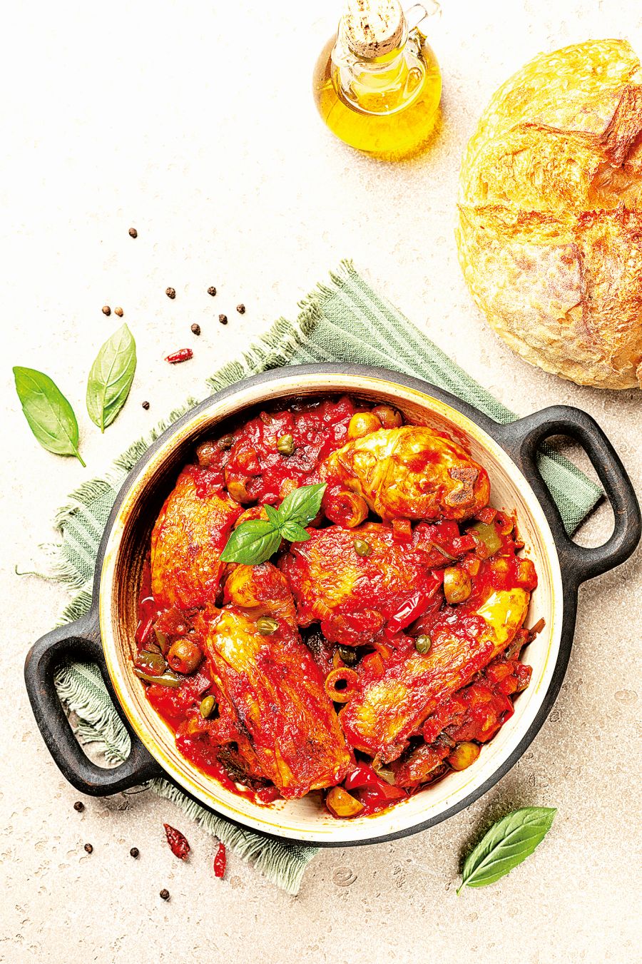 V hluboké pánvi rozehřejte olivový olej. Kuře naporcujte na menší části a ze všech stran je opečte v rozpáleném oleji dozlatova. Poté je odložte stranou.