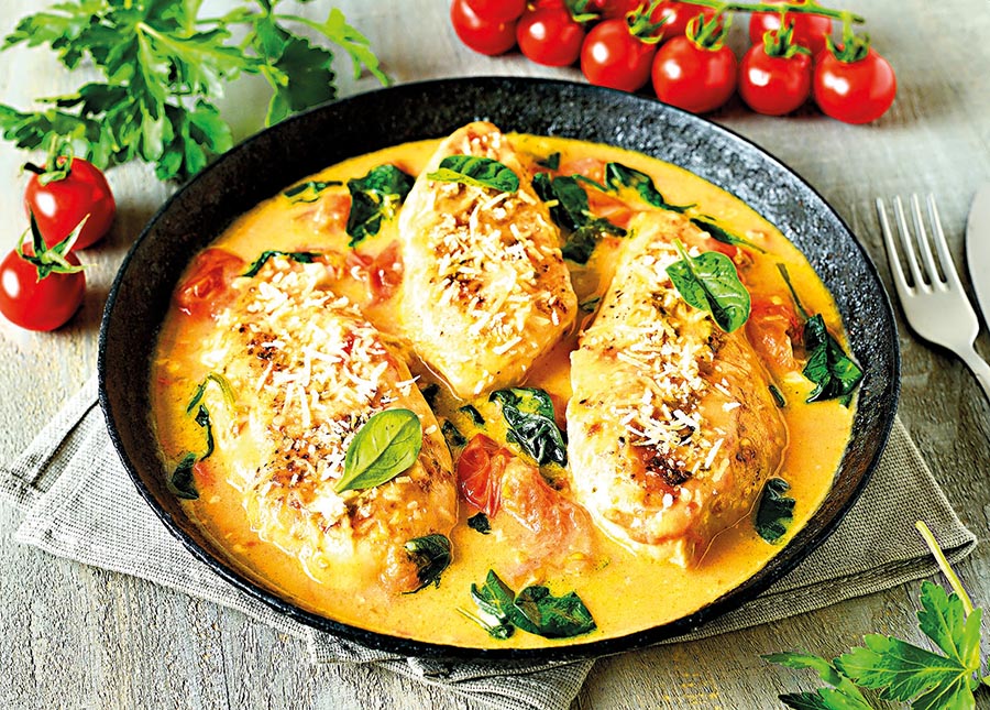 Přidejte špenát a rozpůlená cherry rajčata, promíchejte a nechte krátce provařit.