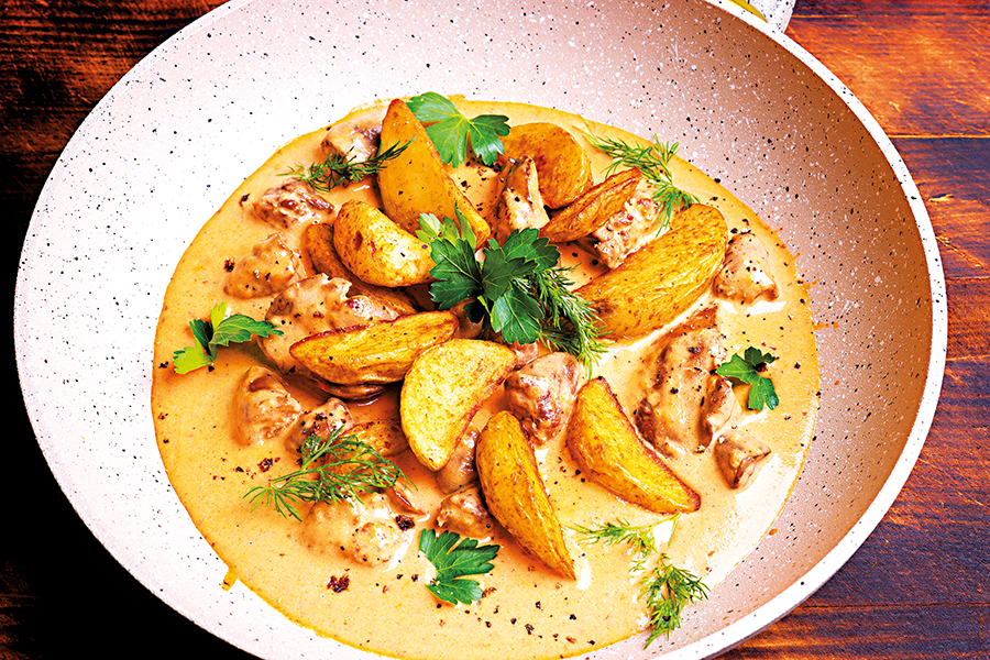 Nechte omáčku pár minut provařit, poté vmíchejte smetanu a vraťte do pánve maso.