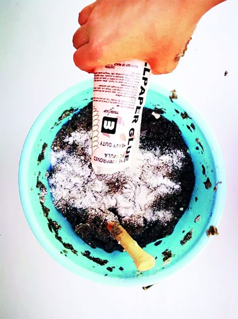 2. Do směsi nasypejte práškové lepidlo na tapety a dobře ji promíchejte. Kaši nechte chvíli odpočinout.