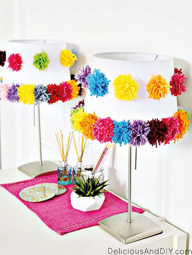 Na závěr můžete bambulky zastřihnout nůžkami, budou tak mít dokonale kulatý tvar. Takto vytvořené bambulky nalepte tavnou pistolí na obyčejné bílé stínidlo.
