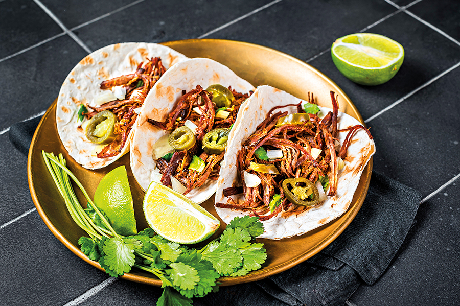 Do tortill vložte vrstvu trhaného masa, posypejte jemně nasekanou cibulí, kolečky jalapeños a čerstvým koriandrem. Zakápněte limetkovou šťávou a podávejte ještě teplé.