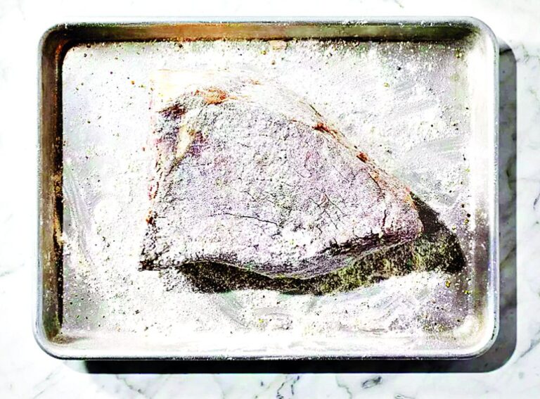 2. Po několika dnech maso vyjměte z marinády a dobře ho osušte papírovou utěrkou. Nechte ho asi hodinu odpočinout při pokojové teplotě a poté ho ze všech stran obalte v hladké mouce.