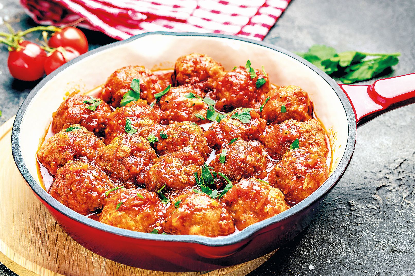 Masové koule společně pečené s rajskou omáčkou, získají větší šmrnc. Podávat je můžete s bramborami, kaší, těstovinami apod.