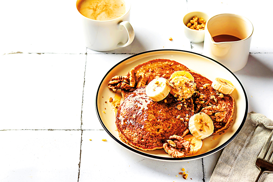 Lívance na talíři ozdobte kolečky banánu, nasekanými vlašskými ořechy a přelijte javorovým sirupem.