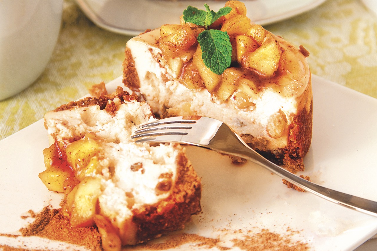 Jablka nakrájejte na kostičky, krátce povařte se skořicí a položte na vrch dortu. Nechte ztuhnout v lednici minimálně 4 hodiny.
