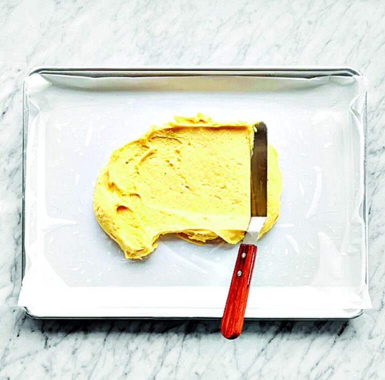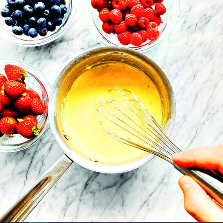 5. Poté směs vraťte do rendlíku od mléka a zahřívejte ji, dokud nezhoustne. Sejměte krém z plotny a nechte ho zcela vychladnout. Následně do něj gumovou stěrkou vmíchejte šlehačku.