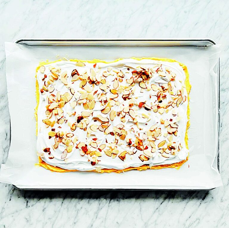 3. Sníh rozetřete na syrový korpus tak, aby na krajích zůstal asi 1 cm místa, bílky se při pečení trochu roztečou do krajů. Povrch posypejte plátky mandlí.