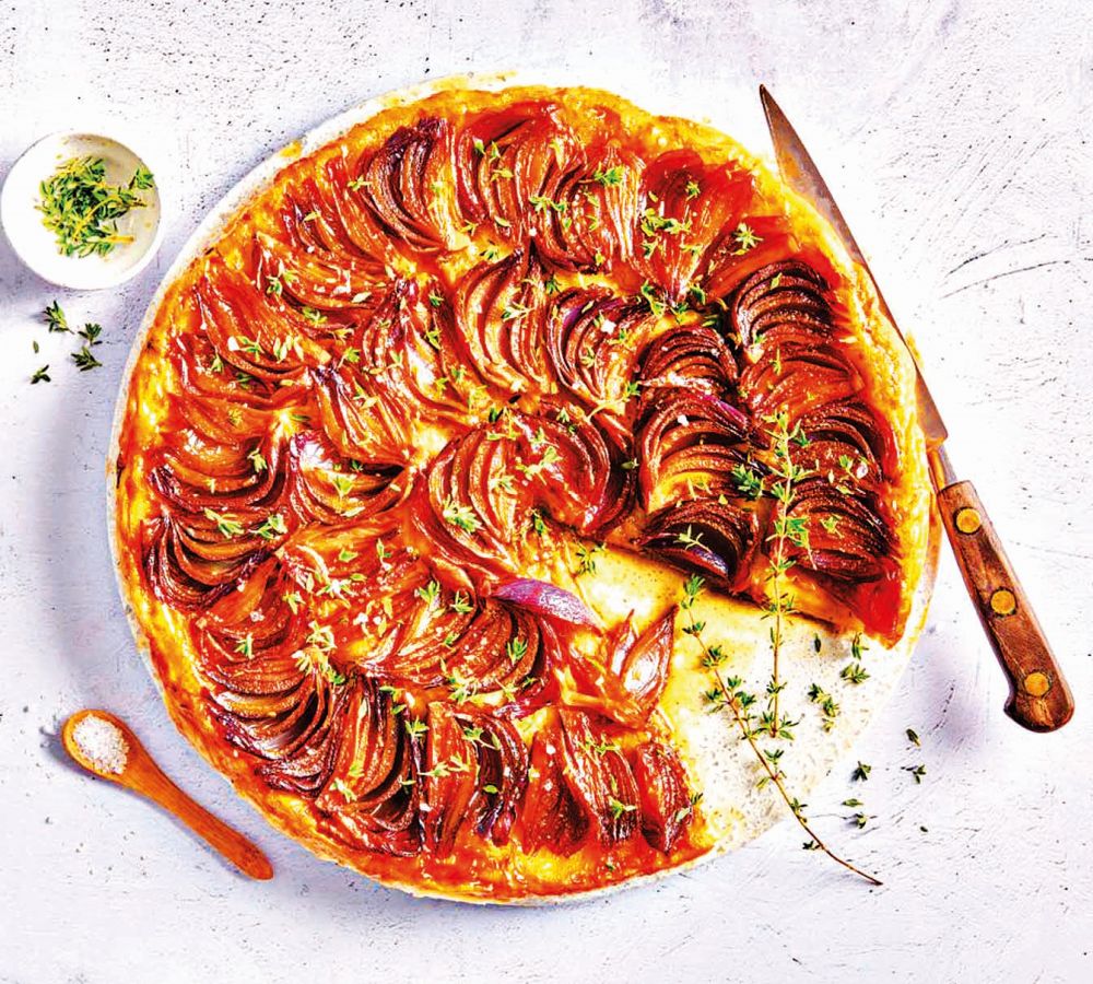 Vypracujte hladké těsto, zabalte ho do potravinářské fólie a nechte hodinu odpočinout v lednici. Na pánvi na olivovém oleji s máslem opečte na klínky nakrájenou červenou cibuli.