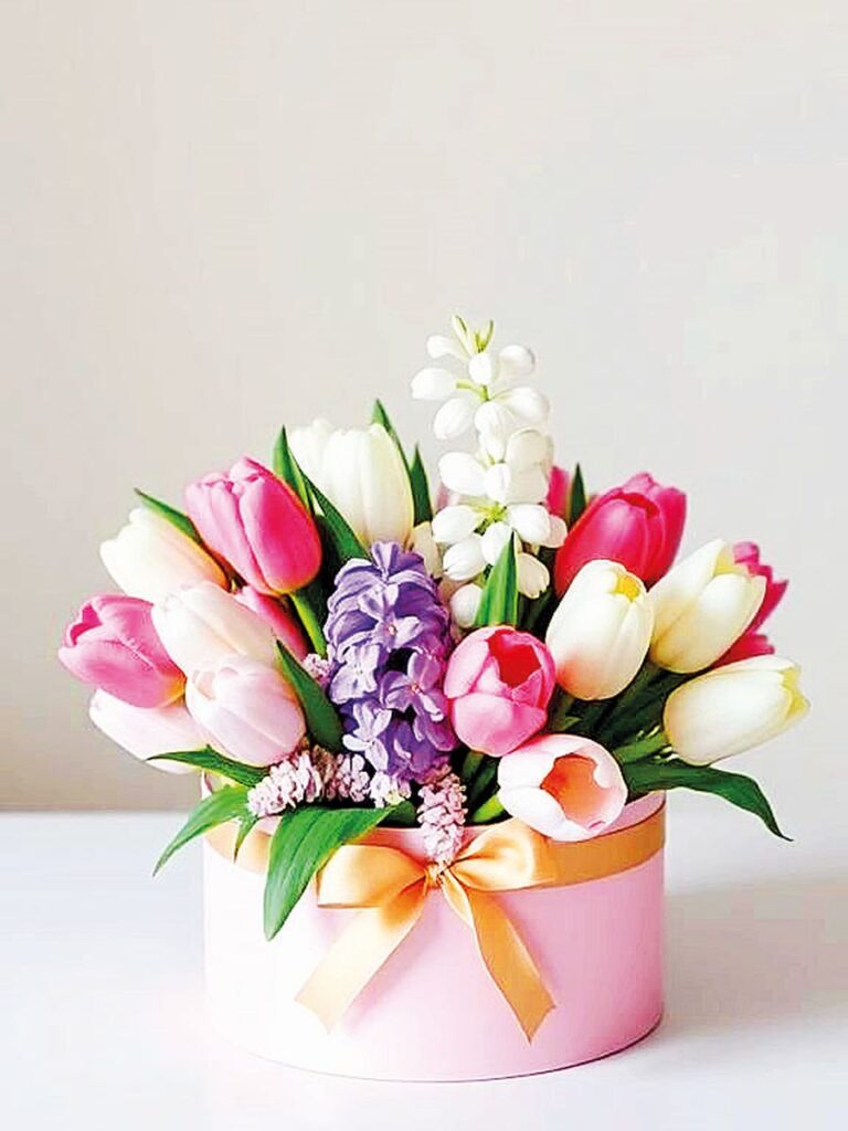 Poté krabici naplňte aranžovací hmotou, navlhčete ji a na závěr do ní zapíchejte své oblíbené květiny, krásně vypadají tulipány nebo růže. Nezapomínejte každý den hmotu zalít trochou vody, aby květiny měly vláhu a vydržely co nejdéle čerstvé.