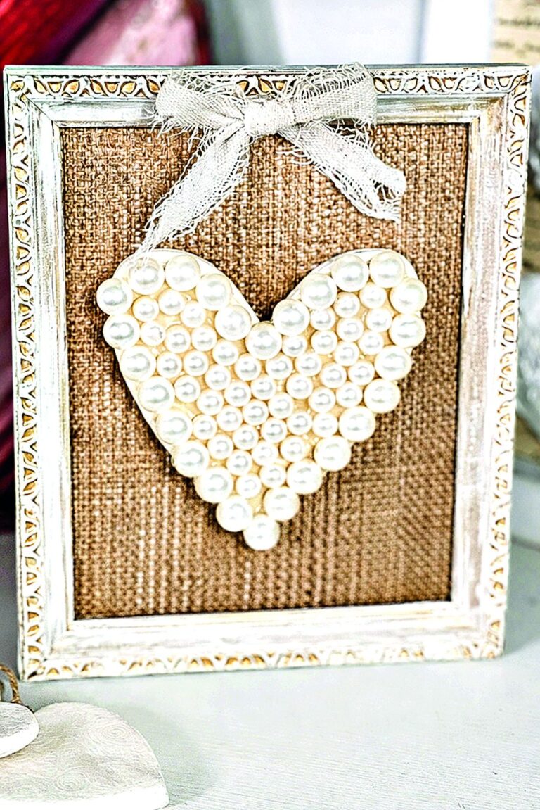 Tavnou pistolí na ni přilepte perly tak, aby vytvořily tvar srdce. Pak už jen stačí karton vložit do rámu a obraz pověsit na zeď.
