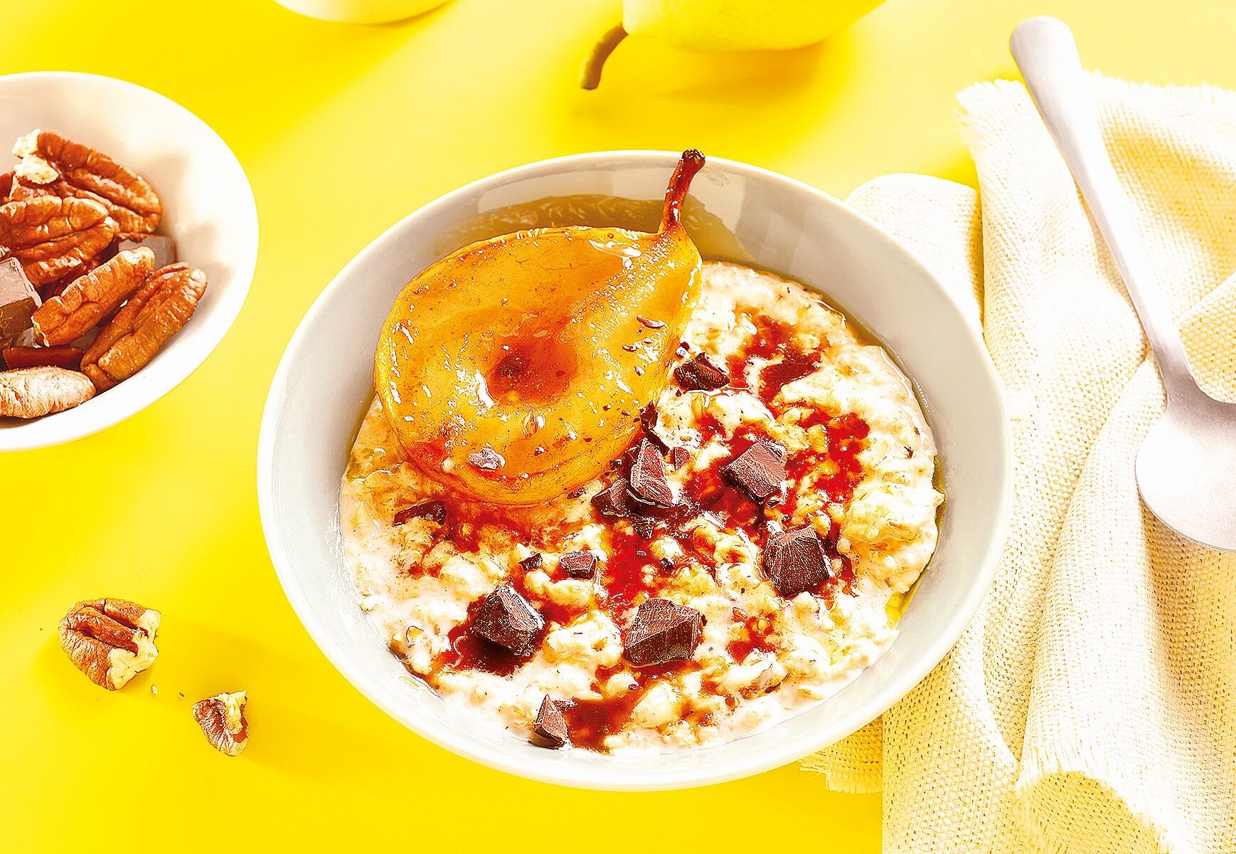 3. Rozdělte kaši do misek a ozdobte zkaramelizovanou hruškou a nasekanými ořechy nebo kousky čokolády. Nechte asi 2 minuty odstát a podávejte.