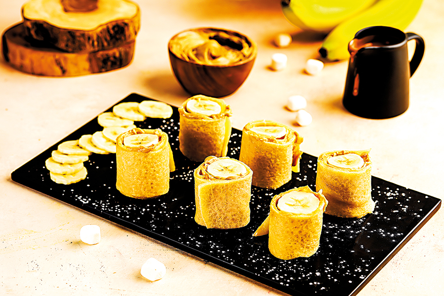 Hotové palačinky potřete arašídovým krémem, položte na ně oloupaný banán a pevně je zarolujte. Poté je nakrájejte na menší rolky.