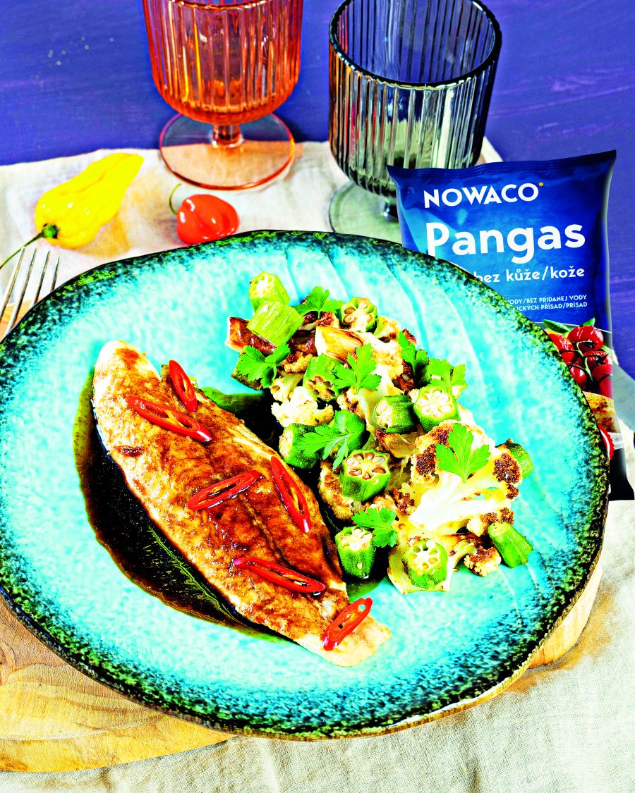 Květák nakrájejte na větší kusy, okru na silnější kolečka, osolte, opepřete a restujte na oleji. Pangase Nowaco osolte, opepřete a opečte na pánvi s olejem z obou stran.