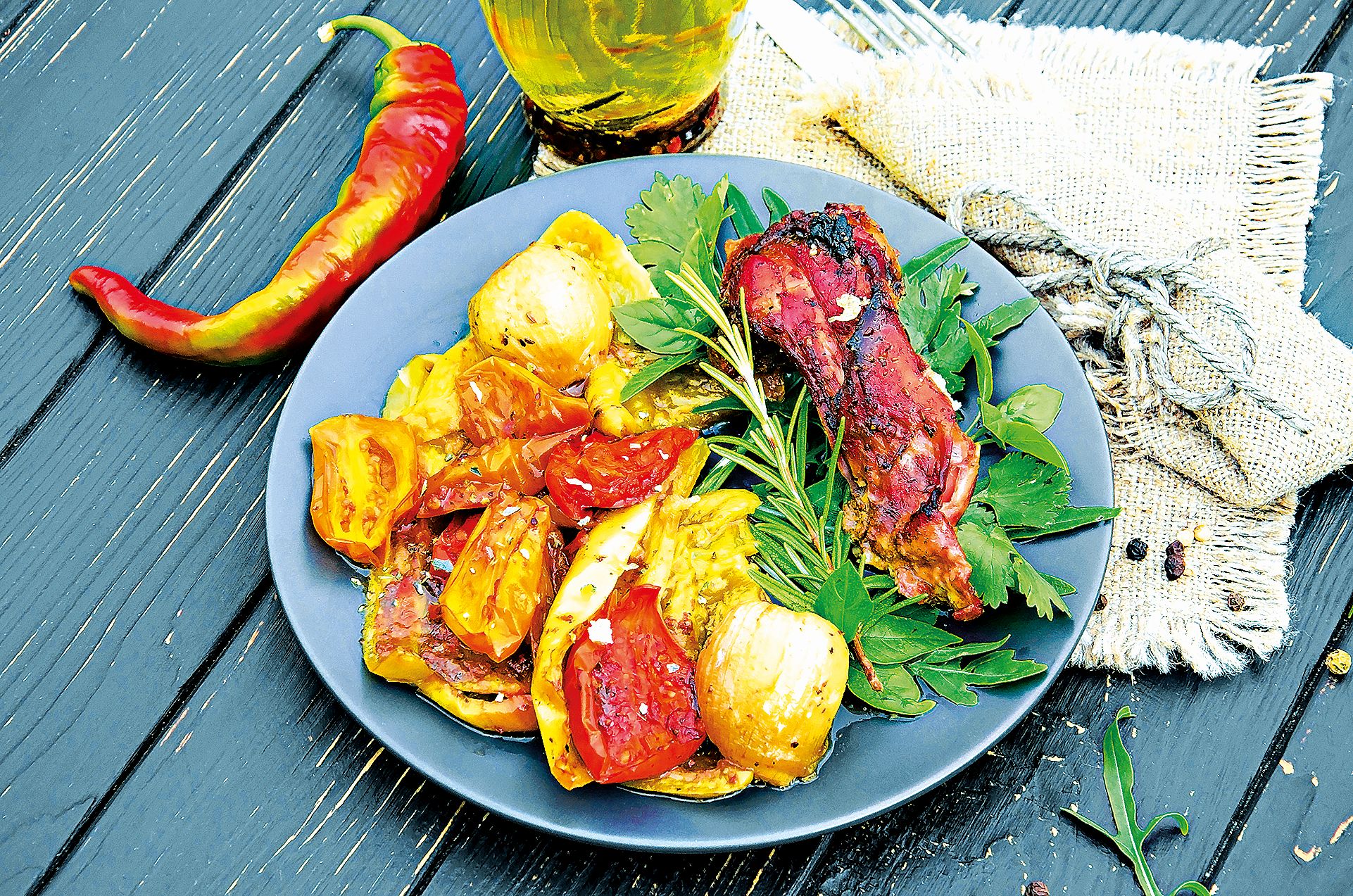 Králičí maso je dietní a lahodné. Upečte si stehna na zelenině, maso bude křehké a zelenina mu dodá přímo delikatesní chuť.