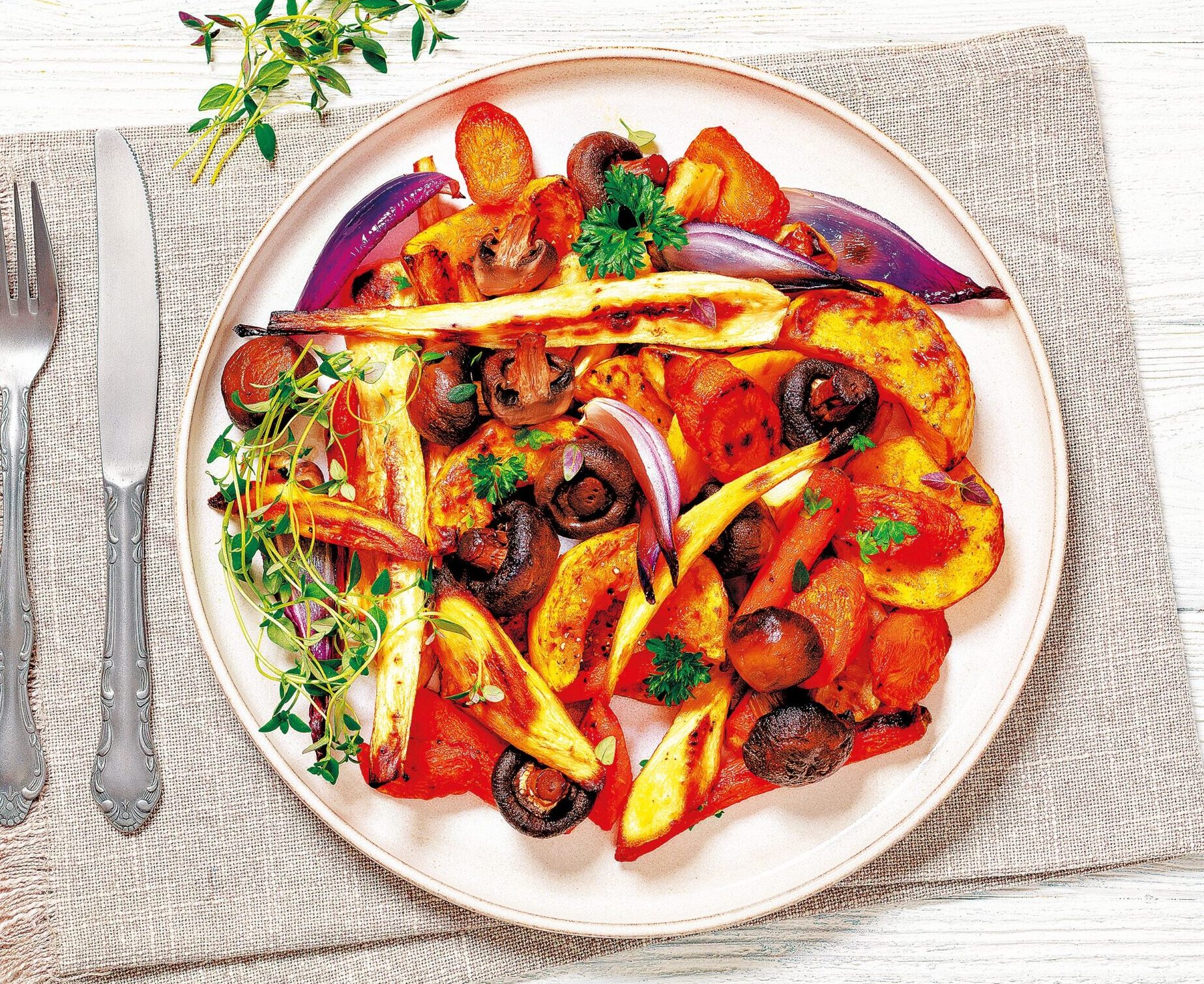 3. Dejte péct do trouby při 190 °C asi na 30 minut. Hotovou zeleninu přendejte na talíře, ozdobte čerstvými bylinkami a podávejte třeba s česnekovým dipem.