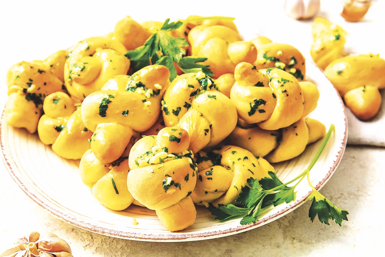 Poté potřete rozpuštěným osoleným máslem s pažitkou a provlékněte do uzlu. Položte na plech a nechte ještě 30 minut kynout. Pečte v troubě vyhřáté na 190 °C přibližně 25 min, dokud uzlíky nenabydou a lehce nezhnědnou.